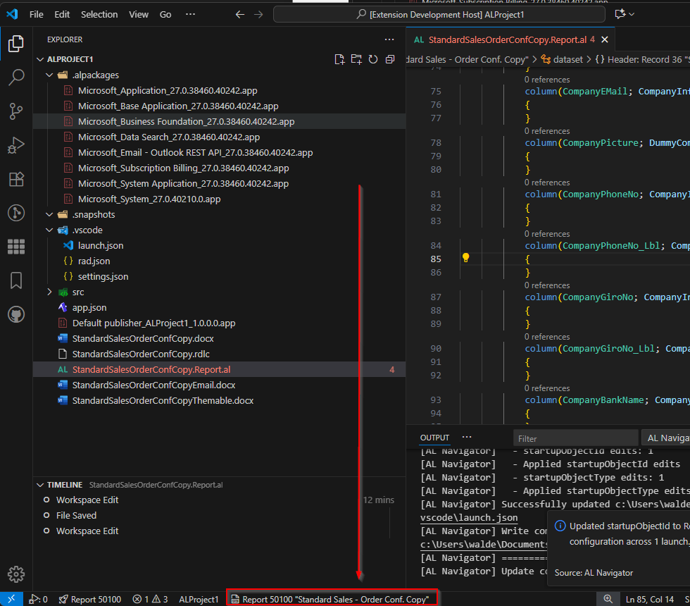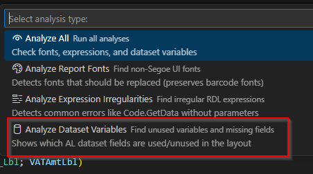 If you rename variables in AL that are also used in RDL(C), the variables in RDL(C) will not be automatically updated. AL Navigator helps you out. Place your cursor on the variable that you want to rename and use the command “AL Navigator: Rename report dataitem column“: