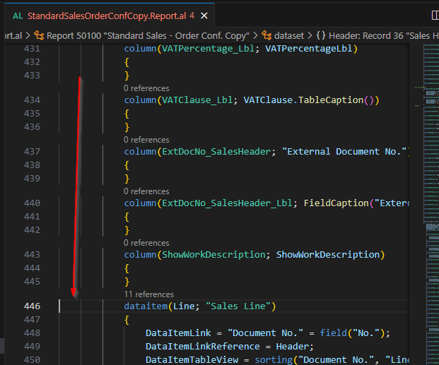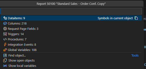 Reports can have a high complexity. The standard “Sales – Order Conf.” (Report 1305) in Business Central has 5 DataItems. This makes it difficult to navigate through the different DataItems, triggers and other code locations.