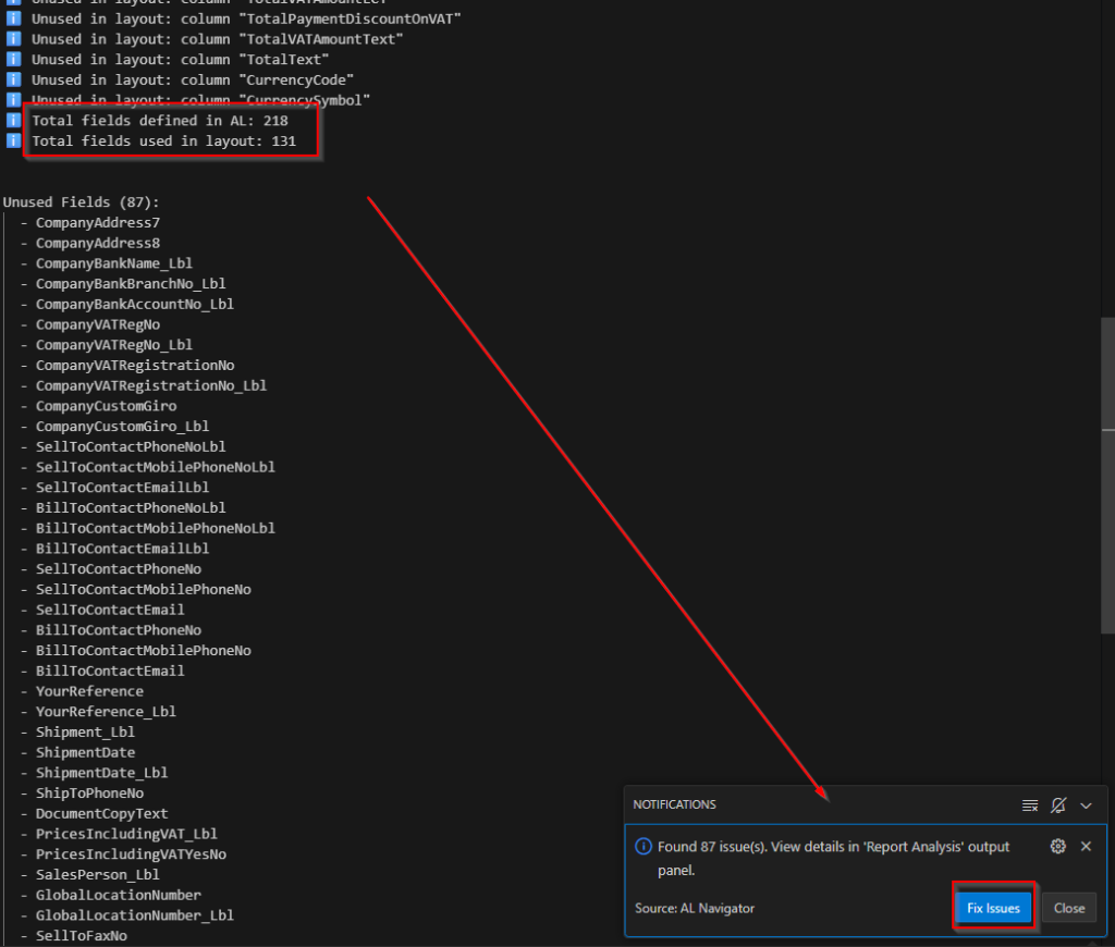 You will be presented with a report that shows you the issues of the report, in this case the variables that are definied in the dataset in AL but are never used in the corresponding RDL(C) layout. Click “Fix Issues” to remove these variables from the dataset.