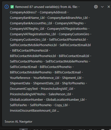 AL Navigator can help identify and remove unused variables from both the AL code and the report dataset.