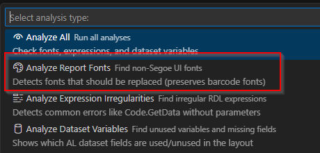 This will give you a detailled report and a possibility to fix the font families in the RDL(C) layout. Barcodes with a font family different than Segoe UI are of course not considered an issue.