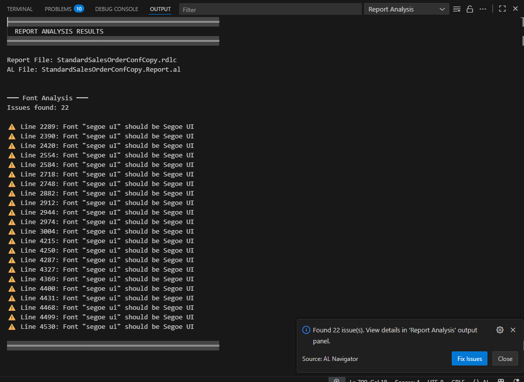 This will give you a detailled report and a possibility to fix the font families in the RDL(C) layout. Barcodes with a font family different than Segoe UI are of course not considered an issue.
