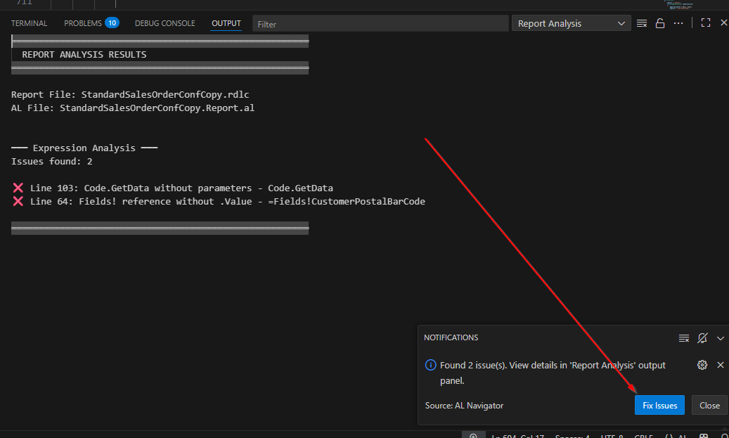 You will be presented with a report that shows you the issues of the report, in this case the variables that are definied in the dataset in AL but are never used in the corresponding RDL(C) layout. Click “Fix Issues” to remove these variables from the dataset.